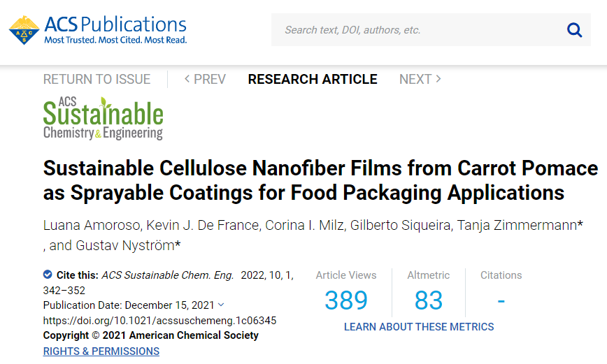 该研究以“Sustainable Cellulose Nanofiber Films from Carrot Pomace as Sprayable Coatings for Food Packaging Applications”为题,发表在最新一期的 ACS Sustainable Chemistry & Engineering 杂志上。