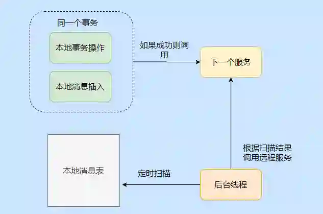 这样本地事务执行成功的话,消息肯定也插入成功,然后再调用其他服务,如果调用成功就修改这条本地消息的状态。