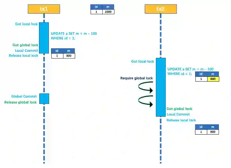 tx1 先开始,开启本地事务,拿到本地锁,更新操作 m = 1000 - 100 = 900。本地事务提交前,先拿到该记录的 全局锁 ,本地提交释放本地锁。