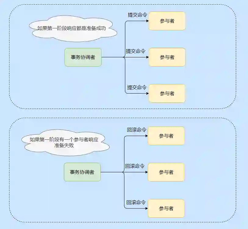 根据收集的响应,如果有一个参与者响应准备失败那么就向所有参与者发送回滚命令,反之发送提交命令。