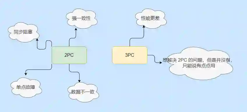 可以看到虽说 2PC 有缺点,但是还是有基于 2PC 的落地实现的,而 3PC 的引出是为了解决 2PC 的一些缺点,但是它整体下来开销更大,也解决不了网络分区的问题,我也没有找到 3PC 的落地实现。