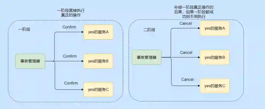 TCC 分为两个阶段,第一阶段是资源检查预留阶段即 Try,第二阶段是提交或回滚,如果是提交的话就是执行真正的业务操作,如果是回滚则是执行预留资源的取消,恢复初始状态。