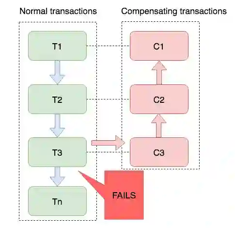 假设有 N 个操作,直接从 T1 开始就是直接执行提交事务,然后再执行 T2,可以看到就是无锁的直接提交,到 T3 发现执行失败了,然后就进入 Compenstaing 阶段,开始一个一个倒回补偿了。