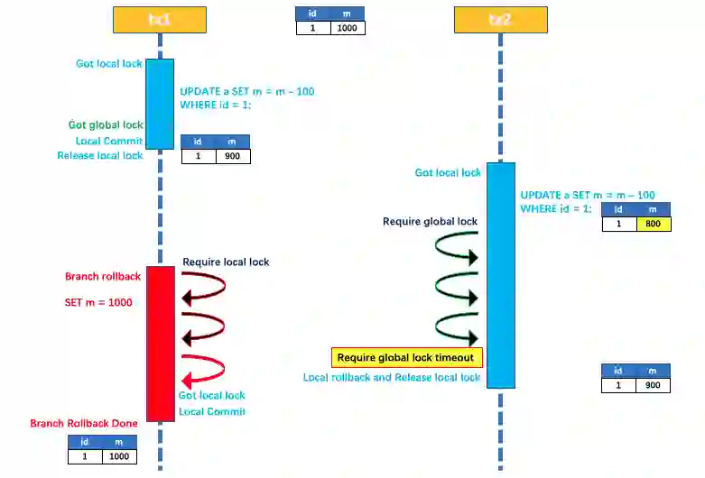 此时,如果 tx2 仍在等待该数据的全局锁,同时持有本地锁,则 tx1 的分支回滚会失败。分支的回滚会一直重试,直到 tx2 的全局锁等锁超时,放弃全局锁并回滚本地事务释放本地锁,tx1 的分支回滚最终成功。