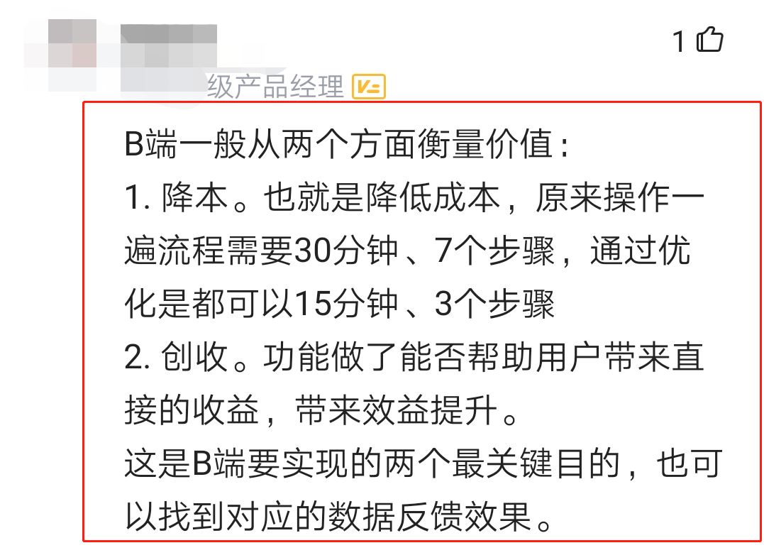 有人认为,可以从降本和创收这两方面来衡量B端产品的价值,并通过具体案例描述进行了解释,比如降低操作成本,帮助用户解决问题获取收益等等。