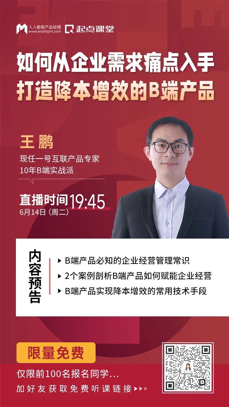 这是由起点课堂出品的B端产品公开课,专为正在做B端产品同学,或者对B端产品感兴趣想要了解相关工作内容的同学打造,课程将由现任一号互联产品专家@王鹏老师直播授课。