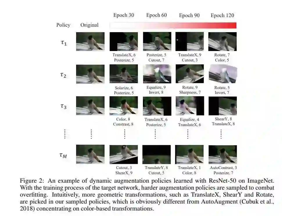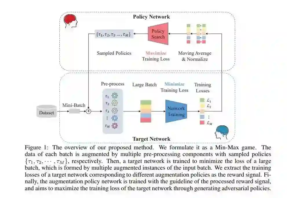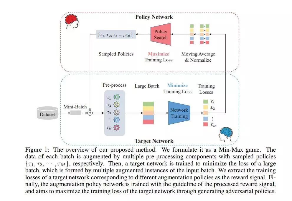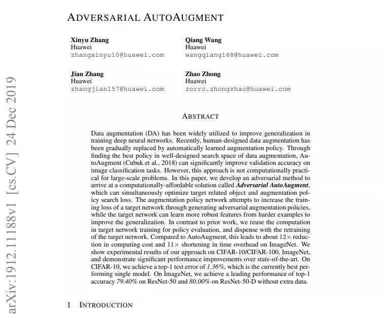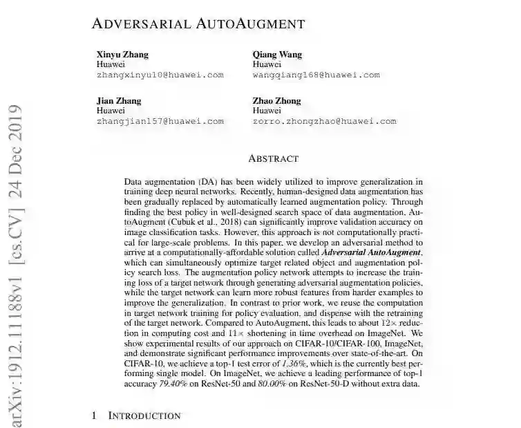 数据增强被广泛用于深度神经网络训练阶段,用以提高模型的泛化性。近年来,人工设置的数据增强策略逐渐被自动数据增强策略替代。通过在设计好的数据增强搜索空间中发现最佳策略,AutoAugment可以显著提升模型在图像分类任务验证集上的准确率。但是,增强方法由于算力限制并不适合大规模问题。这篇论文提出了一种对抗自动增强方法来满足算力有限的数据增强任务,该方法能同时优化目标相关方程与增强策略搜索损失。增强策略网络尝试通过生成对抗增强策略来增加目标网络的训练损失,而目标网络则能从更难分类的样例中学到更鲁棒的特征来提升泛化性。与先前的工作相反,研究者在目标网络训练过程中重新使用算力以进行策略评估,而无需对目标网络进行再训练。和AutoAugment相比,所提方法在算力消耗上大幅削减。在CIFAR-10/CIFAR-100和ImageNet上的实验结果表明所提方法显著提升了当前的最佳基准。