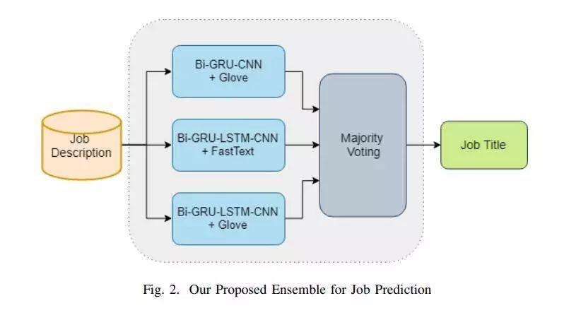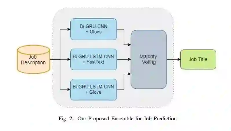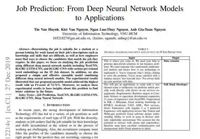 如何根据简历上的信息,例如学历、技能描述等,来判断一份工作是否适合求职者是一个困难的自然语言处理问题。反过来,公司挑选最适合这份工作的人才也是困难的。这篇论文尝试利用不同的深度神经网络模型来学习预测职业,这些模型包括TextCNN,Bi-GRU-LSTM-CNN,以及Bi-GRU-CNN,并用到了基于互联网职业数据集训练的多种预训练词嵌入。这篇论文还提出一种简单但高效的集成模型以包含不同的深度神经网络模型。实验结果表明,所提方法获得了最高为72.71%的F1值。
