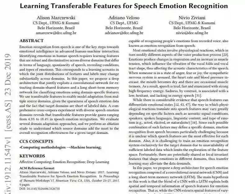推荐理由:语音情感识别是高级人机交互中获取情感智能的关键步骤之一,识别人类语音中的情感需要建模具有鲁棒性和区分性的特征。这篇论文提出了一种深度模型,该模型利用卷积网络来提取领域共享特征,并使用一个LSTM模型以及领域特定特征来对情感进行分类。考虑到现有语音情感数据十分稀缺,文章使用来源于多个源领域的可迁移特征来进行模型迁移。在针对不同语音情感领域的综合跨语料库实验表明,可迁移特征能够将语音情感识别任务的性能提升4.3%至18.4%。