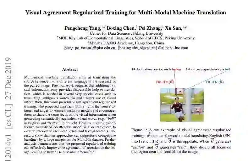 为更好利用视觉信息,这篇论文提出一种视觉一致正则化训练方法。所提方法联合训练源-目标与目标-源的翻译模型,让这些模型在生成语义上等价的视觉词汇时,能共享视觉信息方面同样的焦点,例如英文中的Ball与法文中的Ballon。除此之外,所提方法还使用一个简单但有效的多头交互注意力模型来捕捉视觉与文本特征的交互信息。在Multi30k的实验结果表明所提方法优于基准模型。