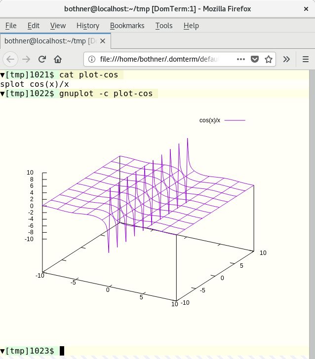 图 3 显示了来自 gnuplot 会话的一个片段。Gnuplot(2.1 或者跟高版本)支持 DormTerm 作为终端类型。图形输出被转换成 SVG 图片,然后被打印到终端。我的博客帖子在 DormTerm 上的 Gnuplot 展示在这方面提供了更多信息。