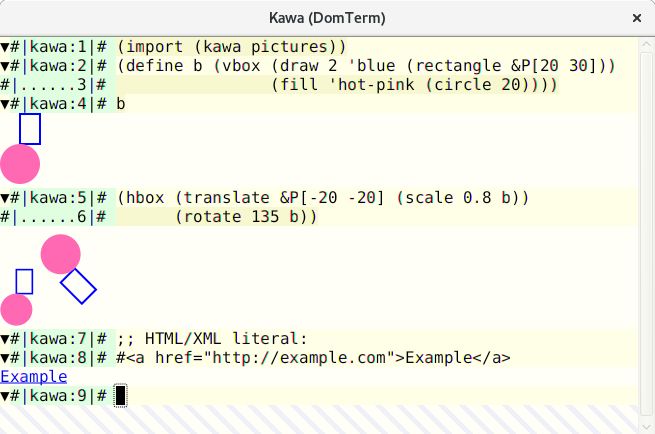 Kawa 语言有一个创建并转换几何图像值的库。如果你将这样的图片值打印到 DomTerm 终端,图片就会被转换成 SVG 形式并嵌入进输出中。