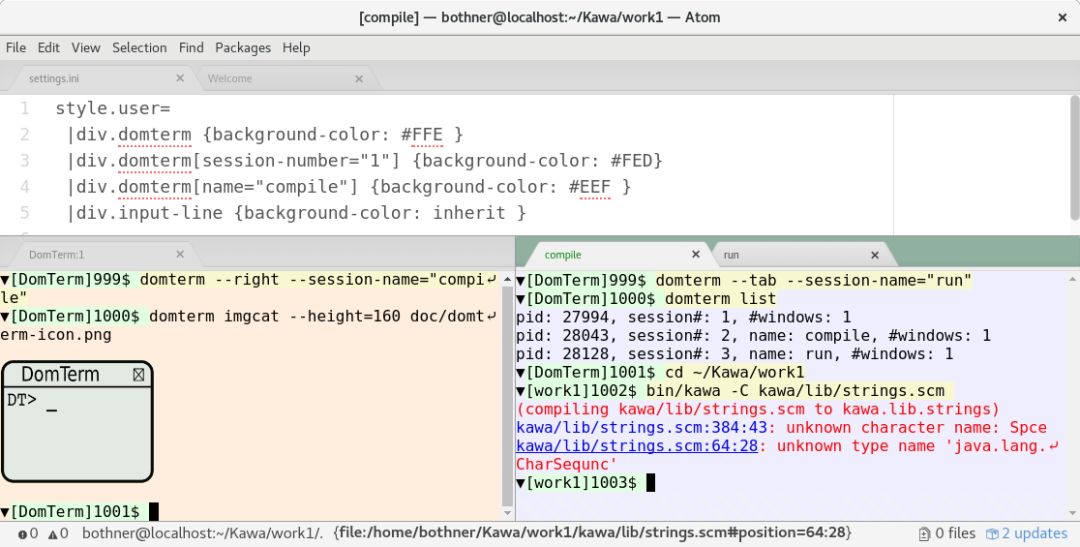 编译器可以侦测到它在 DomTerm 下运行,并直接用转义字符发出文件链接。这比依赖 DomTerm 的样式匹配要稳健得多,因为它可以处理空格和其他字符并且无需依赖目录追踪。在图 4 中,你可以看到来自 Kawa Compiler 的错误消息。悬停在文件位置上会使其出现下划线,file: URL 出现在 atom-domterm 消息栏(窗口底部)中。(当不用 atom-domterm 时,这样的消息会在一个浮层的框中显示,如图 1 中所看到的 PAUSED 消息所示。)