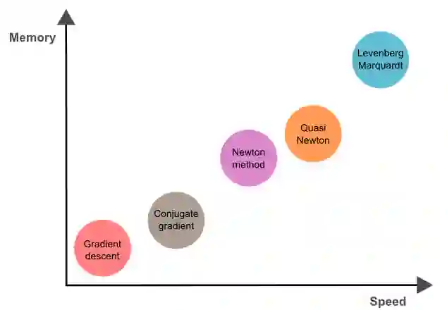 下图展示了所有上文所讨论的算法,及其收敛速度和内存需求。其中收敛速度最慢的是梯度下降算法,但该算法同时也只要求最少的内存。相反,Levenberg-Marquardt 算法可能是收敛速度最快的,但其同时也要求最多的内存。比较折衷方法是拟牛顿法。