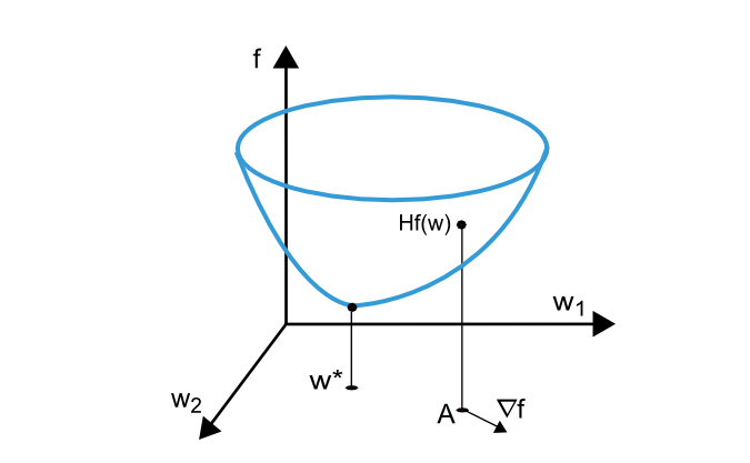 如上图所示,点 w* 是训练损失函数的极小值点。在任意点 A,损失函数能分别对权重求一阶偏导数和二阶偏导数。损失函数的一阶偏导可以使用梯度算符来表示,其中每一个权重的损失函数梯度表示如下: