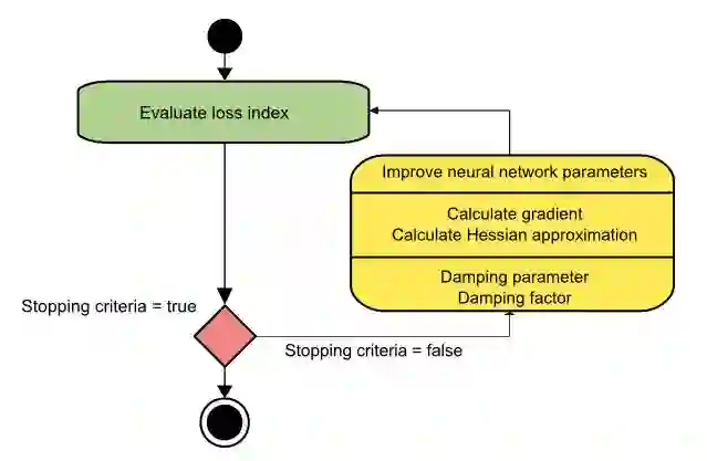 使用 Levenberg-Marquardt 法的神经网络训练过程状态图就如下图所示。第一步就是计算损失函数、梯度和海塞矩阵逼近值,随后再在每次迭代降低损失中调整衰减参数。