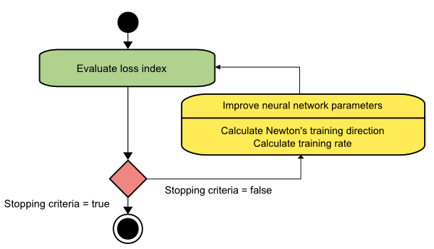 使用牛顿法的训练过程状态图就如下图所示。从此图可以看出来,系统首先通过获得牛顿训练方向,然后获得合适的学习速率来进行参数的更新优化。