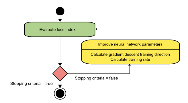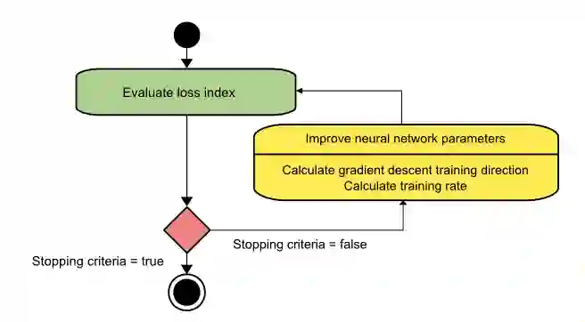 通过这种方式,一般我们会由初始参数向量开始(通常为随机初始化)训练神经网络。然后,算法会更新生成一组新参数,训练损失函数也会在每一次算法迭代中使用更新的参数进行函数值的降低。两步迭代之间的的训练损失减少又称之为训练损失衰减率(loss decrement)。最后,当训练过程满足特定的条件或停止标准时,训练算法就会停止迭代,而这个时候的参数也就是最优参数(神经网络中可能是局部最优解),神经网络的性能也由它们所决定。