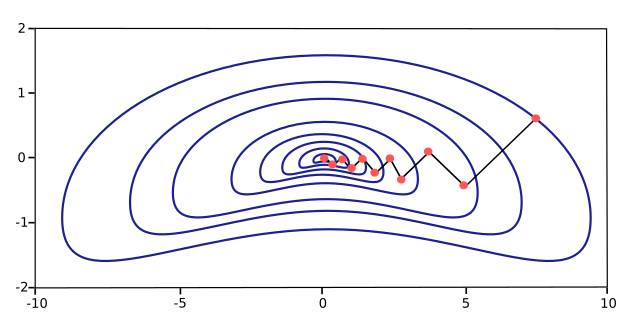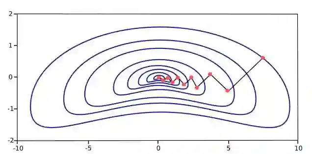 梯度下降算法也有一些缺点,首先就是其迭代方向会呈现一种锯齿现象,其并不能朝着极小值点径直优化,所以迭代的次数也就多,收敛的速度也就慢。当它的函数梯度图又窄又长时(变量没有归一化,值处于不同的量级),迭代所需要的步数就会更多了。最速下降法确实沿着最陡的梯度下降,损失函数减少得最迅速,但这并不代表梯度下降法或最速下降法会最快收敛(因为锯齿现象)。下图就可以直观地了解到这种锯齿现象,因为非线性函数局部的梯度方向并不一定就是朝着最优点。并且该图还表明,如果横轴量级与纵轴量级有差别时,损失函数梯度图会呈现为一种椭圆形,而如果从椭圆长半轴端点开始下降,那么迭代步数就会很多。