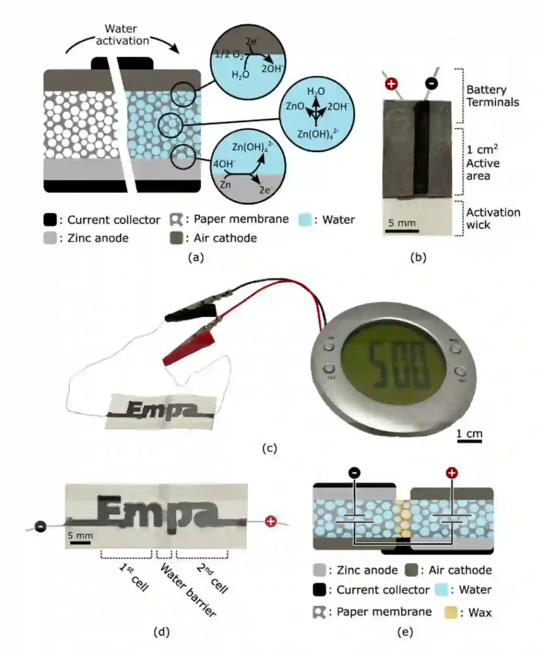 如今,来自瑞士联邦材料科学与技术实验室(Empa)的科研团队,在生物可降解电池方面取得了新的突破——他们在一项概念验证研究,提出了一种可以用水激活的一次性纸电池。