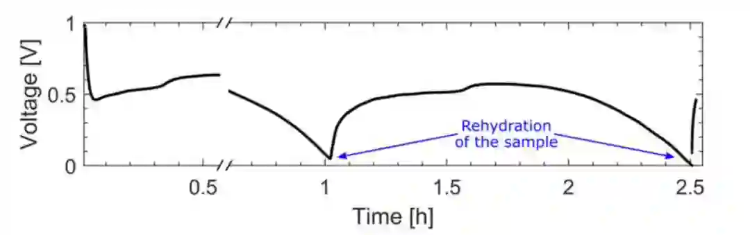 一小时后,单单元电池组的性能会因为纸张干燥而迅速下降。但是,如果再滴上两滴水,它就能再维持一个小时以上稳定的 0.5 伏工作电压。