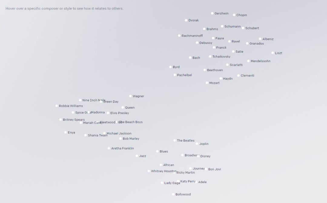 我们可以可视化来自 MuseNet 的嵌入,以深入了解模型所学到的东西。下面 OpenAI 用 t-SNE 可视化了各个作曲家和风格嵌入的余弦相似性。