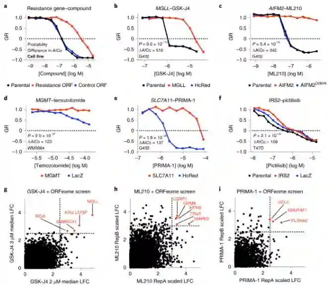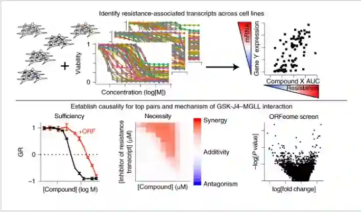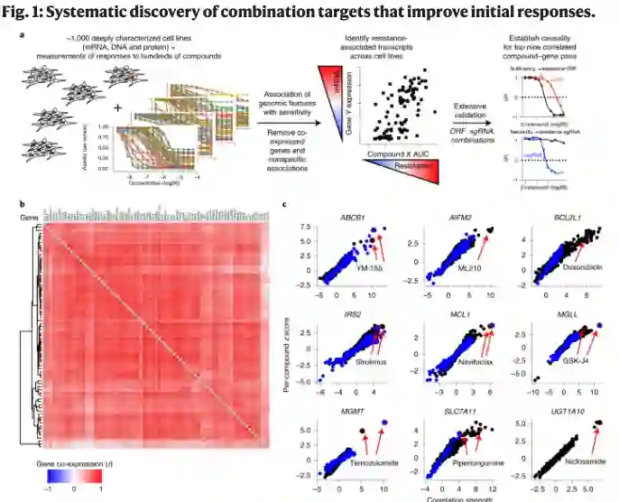 作者假设癌细胞系的基础基因转录状态,再加上小分子的细胞活性谱,可用于确定内在抗性的特定机制并预测克服抗性的药物组合,作者分析了 564,424 个敏感性数据谱来识别候选基因-化合物对,并验证了九个这样的关系。