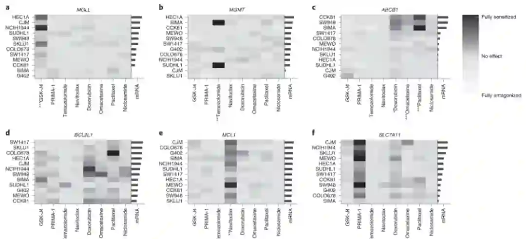 作者确定了CTRP中254个化合物和741个基因的925个化合物-mRNA关系,以及GDSC中151个化合物和347个基因的412个关系。通过对推定的抗性相关转录物进行深入表征,发现4个与几种具有不同机制和敏感性模式的化合物相关(BCL2L1、SLC7A11、UGT1A10和ABCB1),而其余三个对单一化合物(或具有共同敏感性模式的机械相关化合物;MGMT、MCL1和MGLL)具有高度选择性。