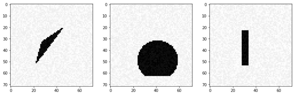 我们的数据集是72x72网格中的一组几何图形(三角形、圆形、矩形)。由于这些是灰度图像,因此它们只有一个频道。下面是一些样本: