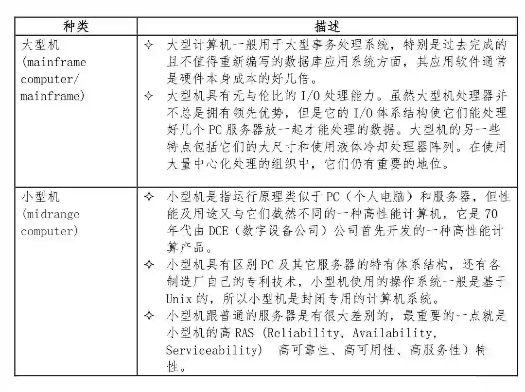 按照服务器体系架构,服务器主要分为非x86服务器和x86两类;非x86服务器包括大型机、小型机和UNIX服务器,它们是使用RISC或EPIC,并且主要采用UNIX和其它专用操作系统,RISC处理器主要包括IBM公司的Power和PowerPC处理器,SUN和富士通合作研发的SPARC处理器。EPIC处理器主要是Intel研发的安腾处理器等。