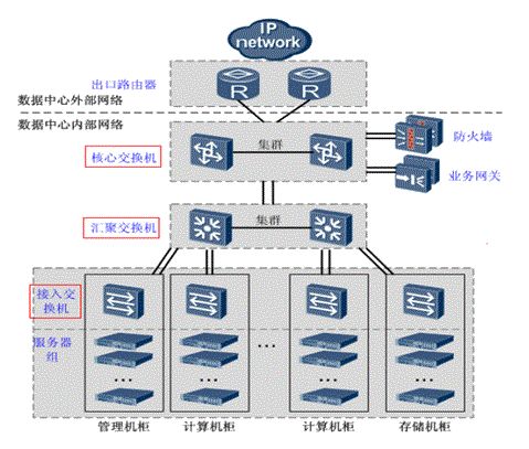 接入交换机:一般用于直接连接电脑。通常将网络中直接面向用户连接或访问网络的部分称为接入层。负责连接机柜内部的服务器。