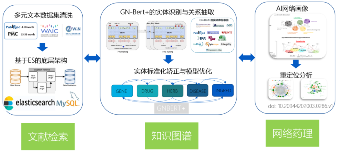 数据:文献数据分为两部分,一是 AIWIN 比赛共约 30 万篇新冠相关文献;二是来自 GeneNet 公司自有文献库的文献,共有约 3600 万篇中英文开源文献摘要信息,全量文本信息存储在本地搭建的 ElasticSearch 搜索引擎中。此外,天士力 GeneNet 公司自行构建了实体数据库,包含 6 大实体类型,一共 26 万个实体(包括中药方剂 52612 个,西药 8241 个,中药植物 15836 个,中药成分 42845 个,疾病 20388 个,基因 / 蛋白 121329 个)。