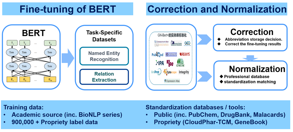 该数据库全部是由各领域专家手动标记。同时,团队还拥有自开发的标记数据,特别是针对中文的、中医药相关的,以及一些补充数据。然后,团队从基础 BERT 预训练模型(基于英文维基百科和 BooksCorpus)开始,针对实体识别任务进行 fine-tuning。
