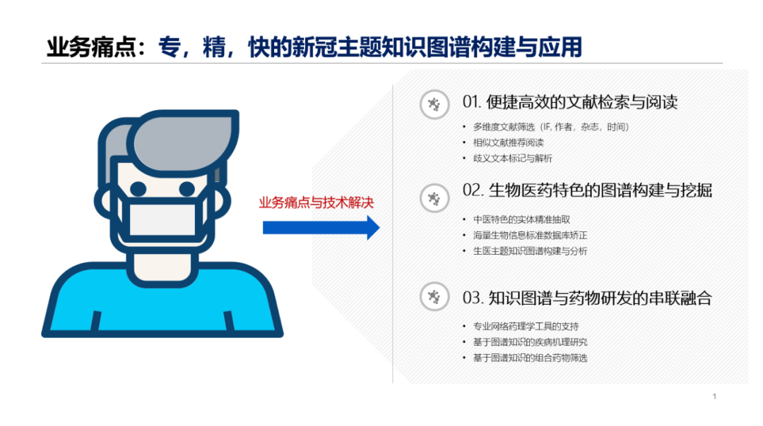 COVID-19 病毒的大流行,激发了全球科学家空前的合作研究,期间产生了大量针对疾病机理、临床诊断、用药治疗层面的科研文献。然而,为了跟踪和了解新的研究内容,研发人员需要在论文的查找、研读和解析上花费大量精力。