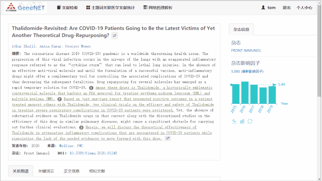 点击进入某篇文献后,会有知识图谱显示,并且与文本标记可交互访问,同时还有词云显示、相似文章推荐等功能。
