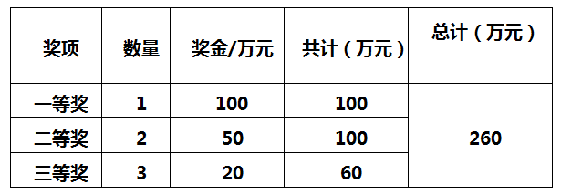 进入大赛决赛名单且获得一等奖、二等奖、三等奖奖项的队伍,分别可获得 100万、50万、20万的奖金。奖项详细设置如下: