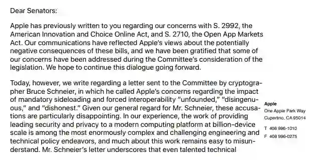 针对这一法案,苹果给参议院司法委员会发出了一封信,苹果在这封信中坚决反对为 iPhone 和 iPad 等 iOS 设备开启侧载功能,这样会令苹果设备的安全性降低。苹果在信中指出了许多安卓平台第三方应用商店的例子,例如感染了恶意软件的应用以及盗取用户数据的应用等。