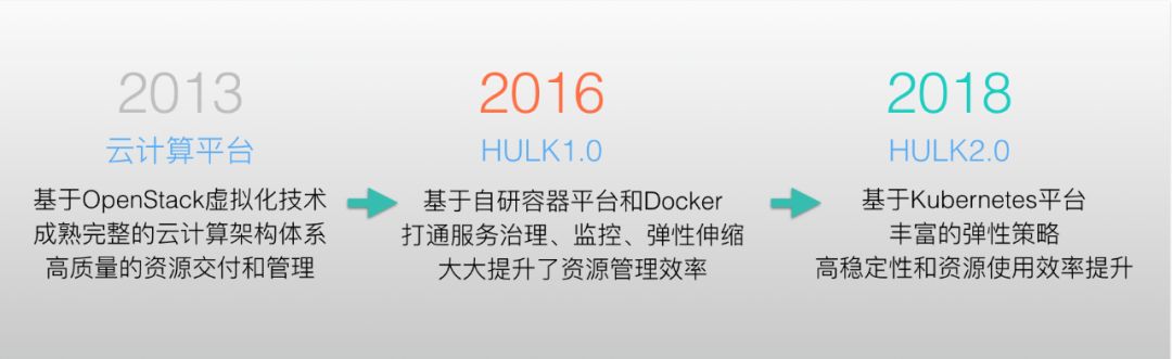 美团点评在集群管理和资源优化这条道路上已经“摸爬滚打”多年。2013年,开始构建基于传统虚拟化技术的资源交付方式;2015年7月,开始建立完善的集群管理与调度系统——HULK,目标是推动美团点评服务容器化;2016年,完成基于Docker容器技术自研实现了弹性伸缩能力,来提升交付速度和应对快速扩缩容的需求,实现弹性扩容、缩容,提升资源利用率,提升业务运维效率,合理有效的降低企业IT运维成本;2018年,开始基于Kubernetes来进行资源管理和调度,进一步提升资源的使用效率。