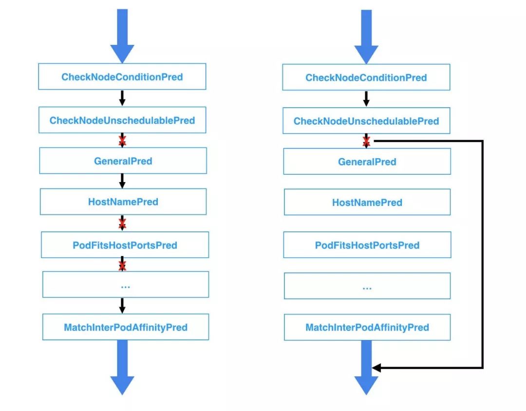 通过深入分析调度过程可以发现,调度器在预选阶段即使已经知道当前 Node不符合某个过滤条件仍然会继续判断后续的过滤条件是否符合。试想如果有上万台 Node节点,这些判断逻辑会浪费很多计算时间,这也是调度器性能低下的一个重要因素。