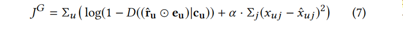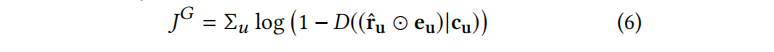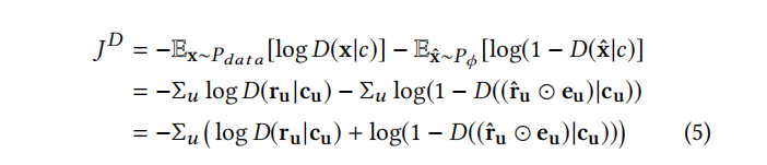 给出生成器G的目标函数:接着来看判别器网络的设计:判别器的输入是经过了和真实评分过的项目向量(只有0/1)进行masking的操作之后的生成向量或者用户真实的评分向量u,用户的描述信息向量c。输出的结果是一个概率值代表输入的是真实的评分向量的概率。