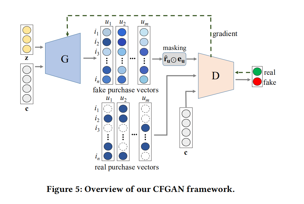 首先我们关注生成器网络的设计:原文中提到,生成器G的输入中,c是描述用户的信息,诸如年龄等,但是原文中是使用一个用户的购买向量作为该用户的描述信息c:_In our methods, we use auser’s (or, an item’s) purchase vector to specify a user (or, an item).[1]_z在传统的GAN网络中应该是代表噪声,但是原文提到他参考了IRGAN和GraphGAN的做法,用用户的购买向量作为z了。_In addition, as in the other GAN-based CFs , we do not usethe random noise variable z since our goal is to generate a single,most plausible recommendation result to a target user rather thanmultiple outcomes.[1]_c和z经过生成器网络后,输出生成的用户购买向量,向量中的值代表的是该用户购买物品的概率。值得一提的是,生成的购买向量在放入生成器网络前,经过了masking的操作,原文的说明是为了让生成的向量和真实向量一样具有稀疏性,通过这样的操作,也就使得网络在训练的过程中 ,只会考虑在真实的购买项目上的生成的值。