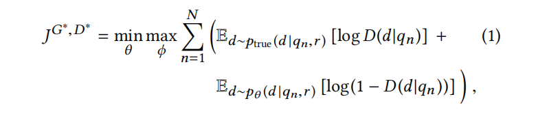 考虑我们有一些序列query(IRGAN应用在推荐系统中的时候query是代表user profiles),document是一些和query相关的文档(在推荐系统中document是information items)。query和document之间的相关性用r来表示。我们用条件概率分布 来表示真实的序列和文档之间的潜在概率分布,给定从训练数据中观察得到的条件概率分布 ,从而设计出IRGAN包含的两个模型: