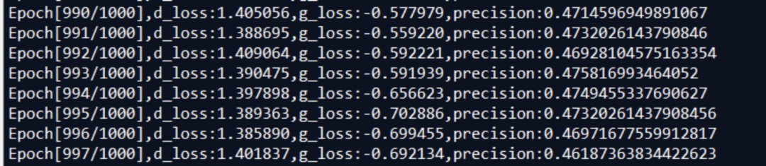 从实验结果可以看出,判别器的性能在经过初期的上升后就会持续下降到一个很差的结果上,判别器的性能太差会导致生成器缺少“督促”,因此生成器的性能也得不到提升。