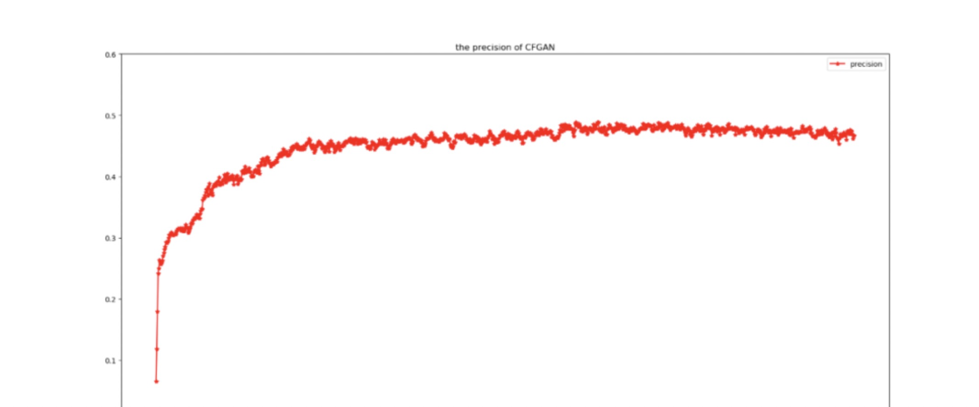 IRGAN的问题在于训练过程中,生成器会慢慢学到真实的概率分布(下图 a-b的过程),从而生成和真实情况相同的项目ID,但是这会让判别器“感到困惑”,比如下图中的i3,既出现在“real”中,被标记为真实数据,又出现在“fake”中,被标记为生成的数据。这种相互冲突的判别会使得判别器的迭代出现问题 ,从而导致判别器的性能下降。CFGAN一文中用实验展示了该问题: