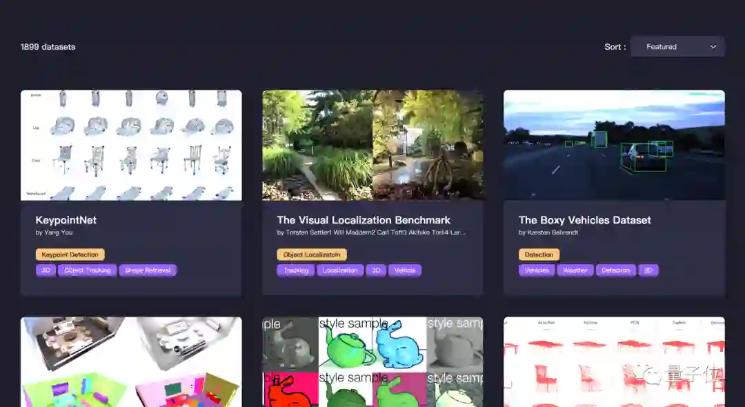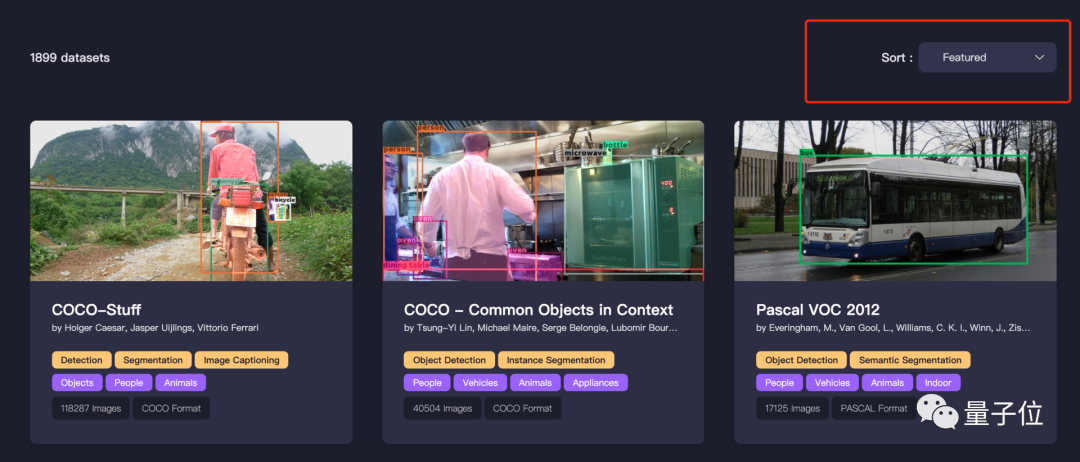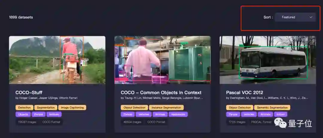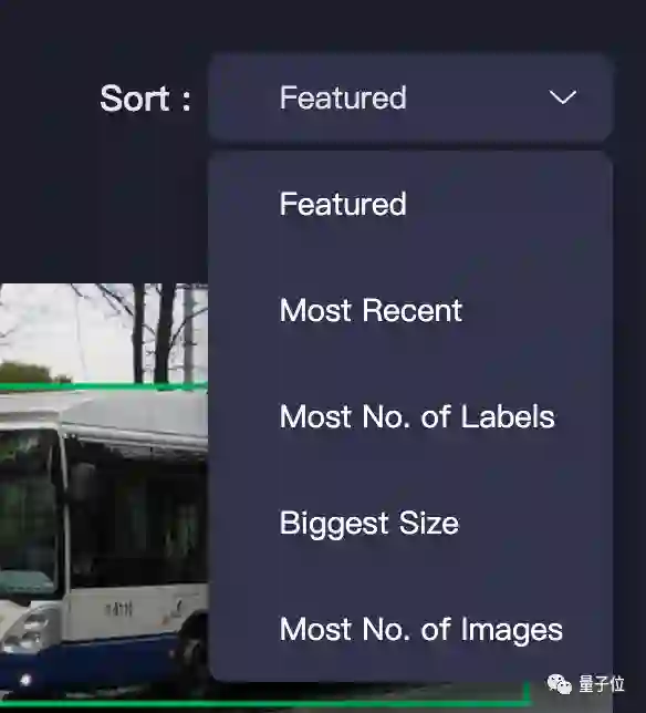 我们也看到,这是按照精选进行排序。除此之外,你还可以选择「最新」、「最多标签数」、「数据集大小」、「图片数量最多」这些分类。