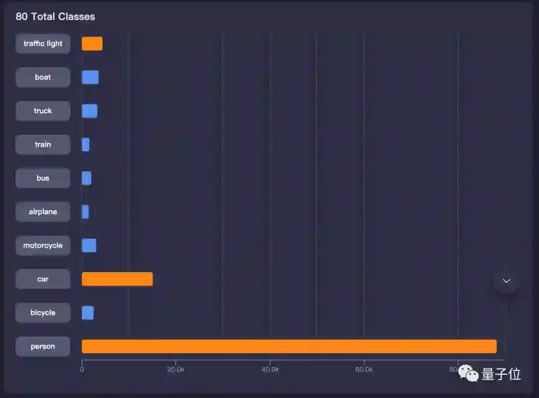 以这个数据集为例,那么共有80个类别,其中交通信号灯、汽车、人的标签较多,其中「人」这个标签就有近9万张图像。