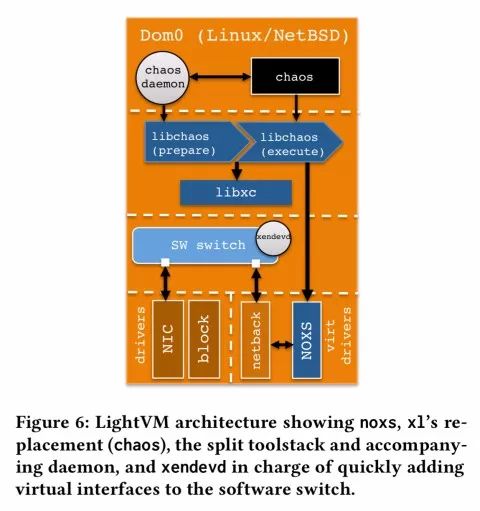 LightVM架构显示了noxs、x1的替代者(chaos)、splittoolstack及配套的守护进程以及负责迅速为软件交换机添加虚拟接口的xendevd