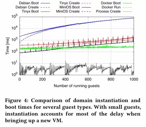 随着我们不断创建虚拟机,创建时间显著延长(注意对数尺度):创建第1000个Debian、Tinyx和unikernel来宾分别需要42s、10s和700ms。