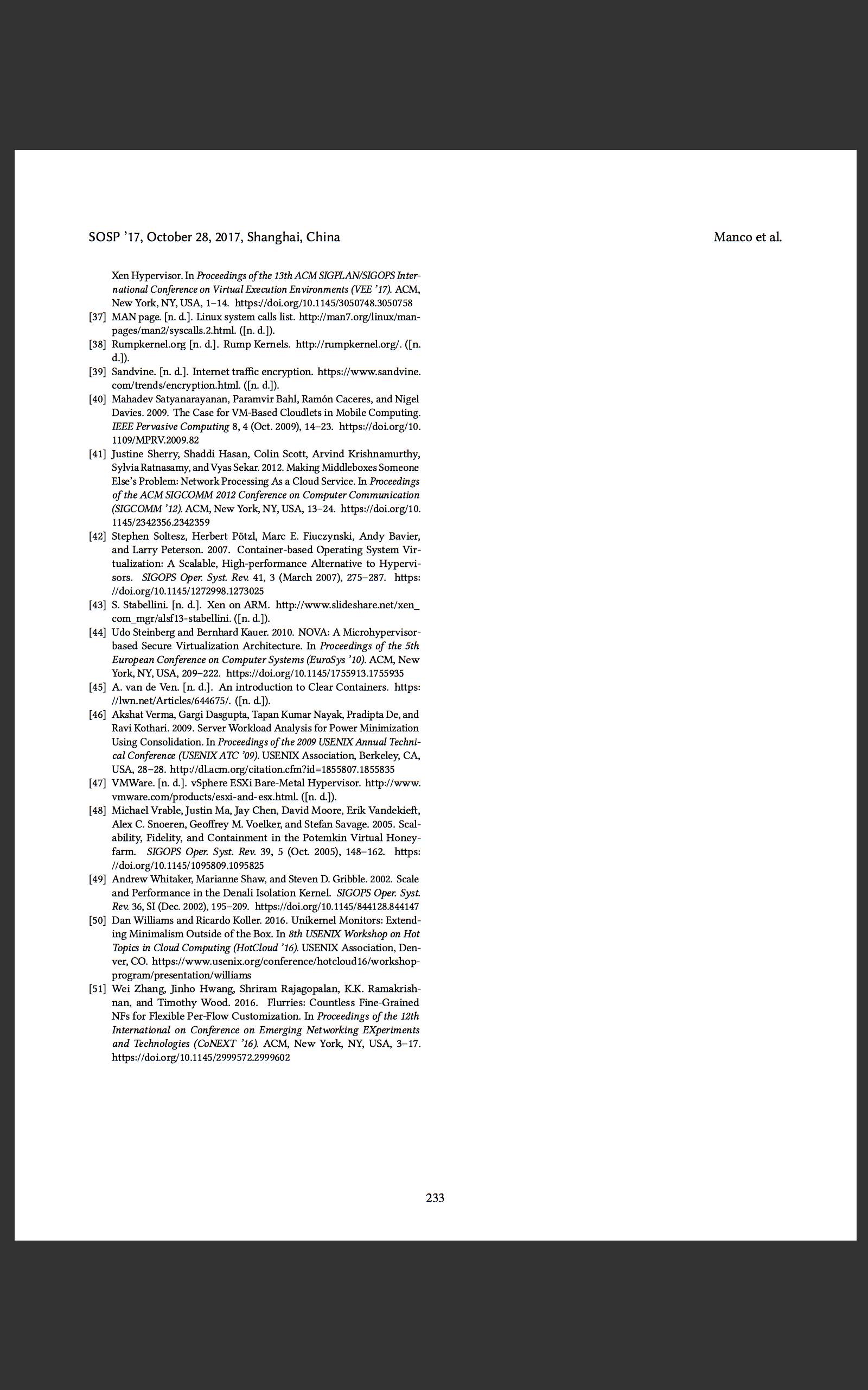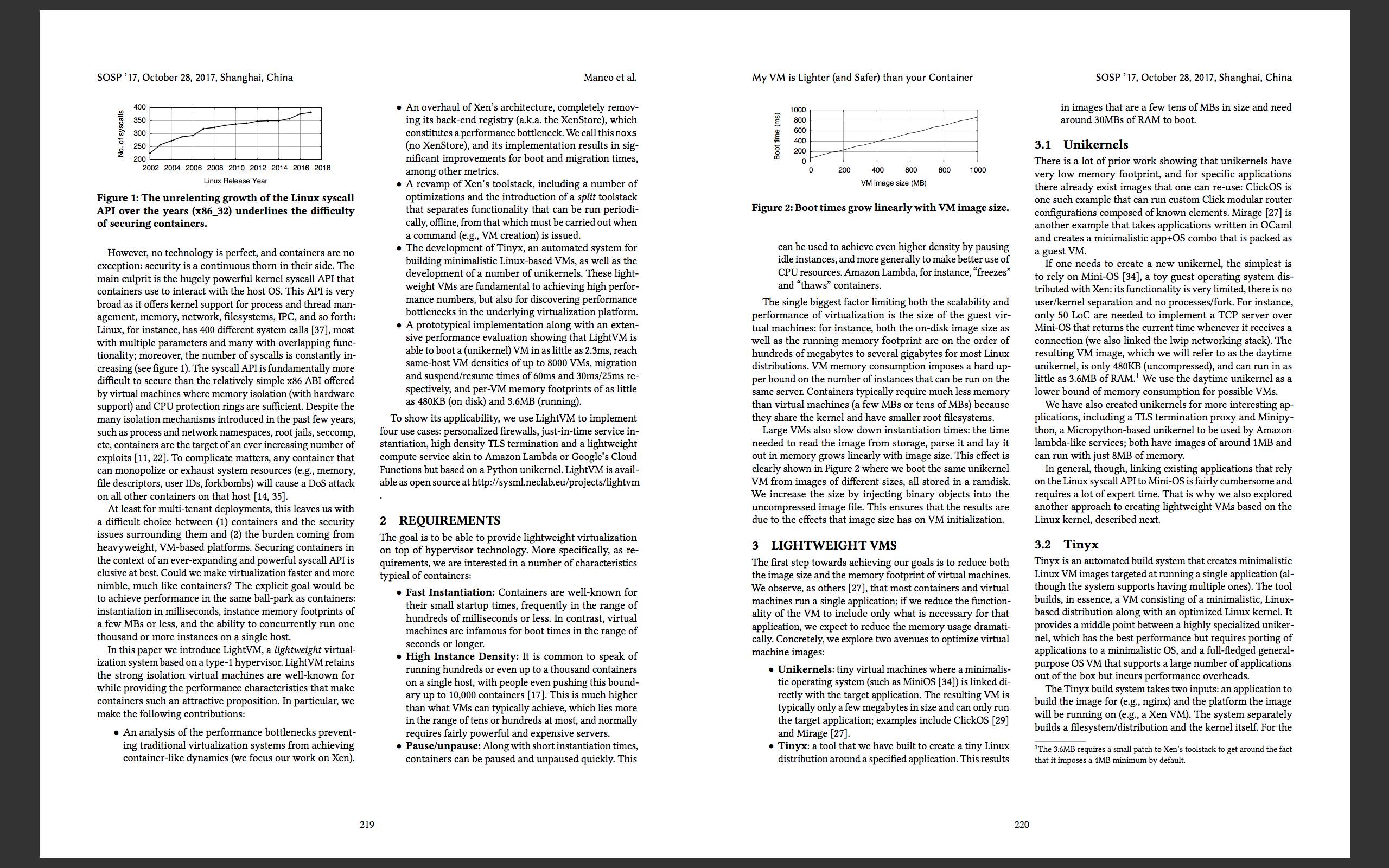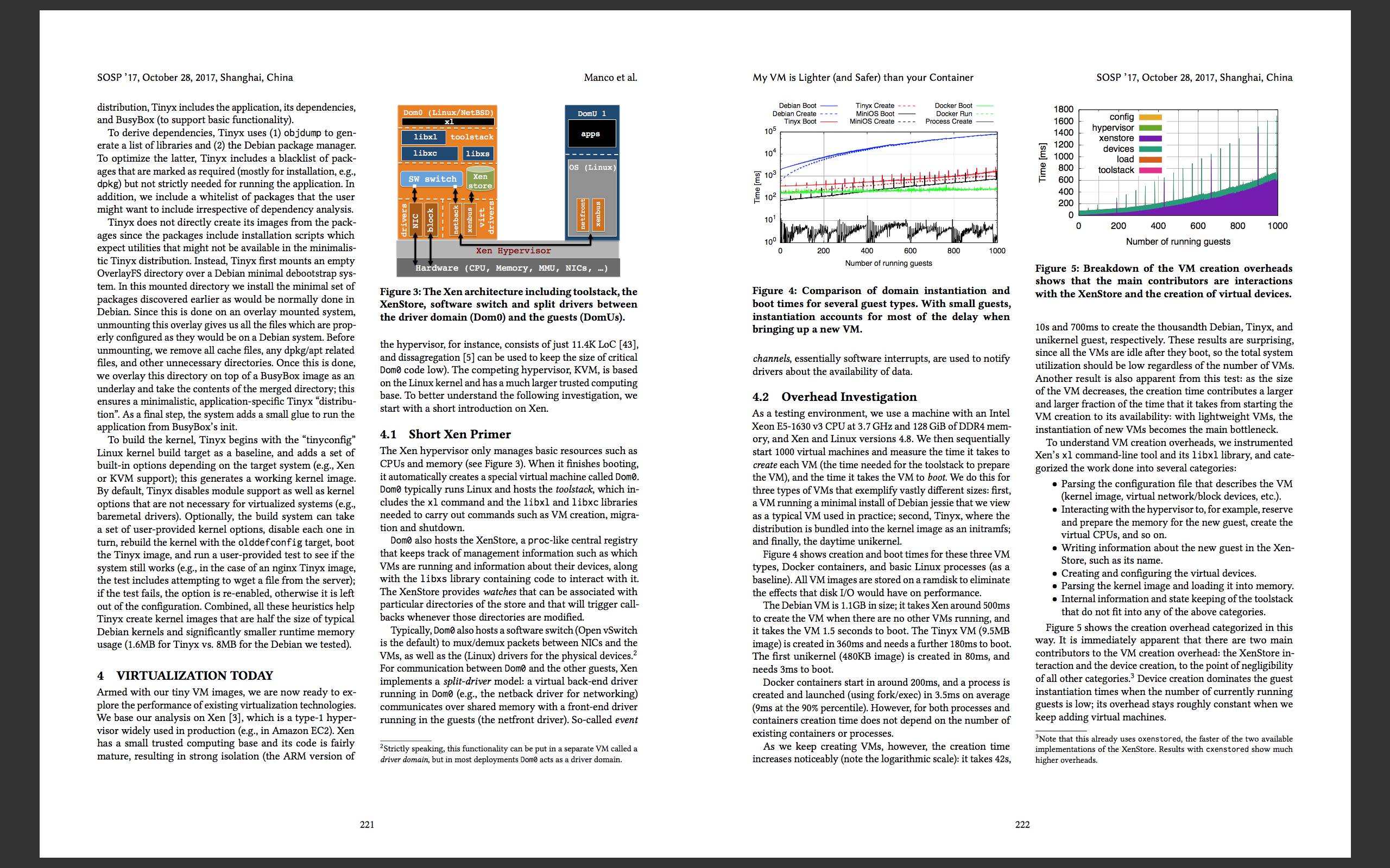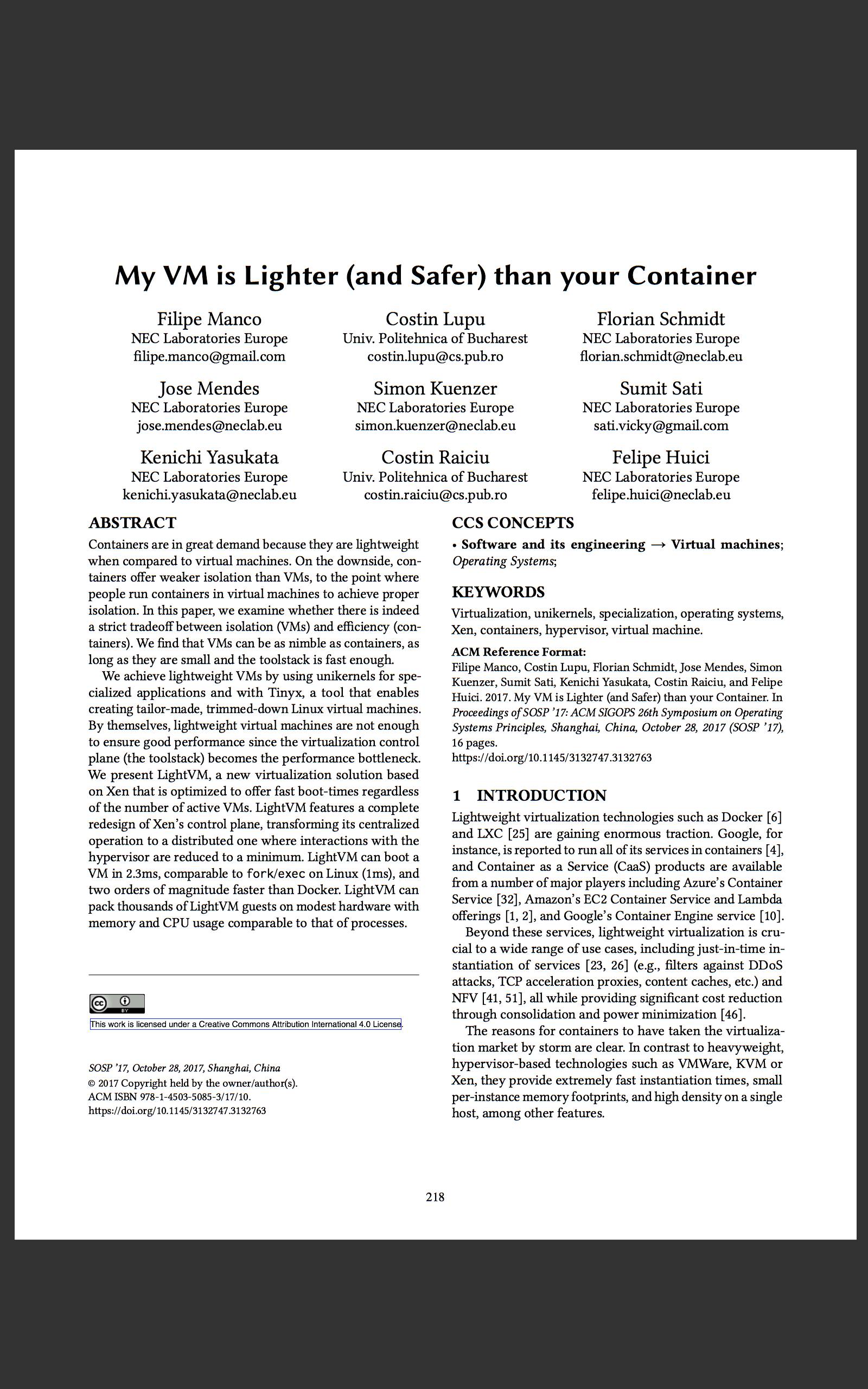 我们可以在改善虚拟机的隔离的同时拥有容器的高效吗?在这篇论文中,几位作者研究了基于Xen的虚拟机性能的边界。他们发现了启动大量轻量级虚拟机(包括unikernel和最小Linux虚拟机)时出现的瓶颈,并消除了瓶颈。因而获得的系统名为LightVM,并借助最小的unikernel镜像,可以在短短4ms内启动虚拟机。相比之下,Linux上的fork/exec则需要大约1ms。在同一个系统上,Docker容器启动需要大约150ms。