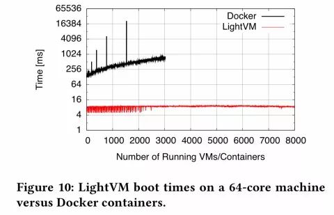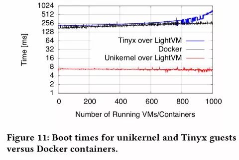 这些结果是在LightVM来宾(guest)是unikernel的情况下获得的。你可能只会在特殊情况下创建unikernel。(本文中一种颇有意思的例子是基于Micropython的unikernel,它可以用来支持serverless函数的执行)。几位作者还开发了一个名为TinyX的自动化构建系统,用于创建旨在运行单个应用程序的最小Linux虚拟机镜像。如果我们比较一下TinyX虚拟机和Docker的启动时间,性能非常接近于每个内核大约250个虚拟机/容器。